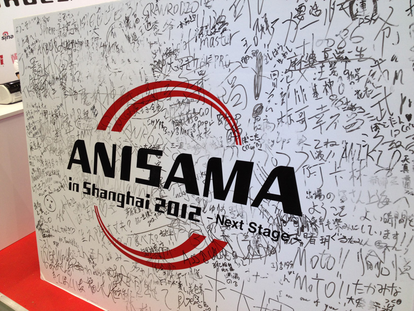 同时,展台上有一块大型的投影屏幕,一整天不间断地播放着历届ANISAMA演唱会的盛况视频,那一位位耳熟能详的歌手,即将在金秋十月来到上海,给大家带来一场零距离的视觉和听觉盛宴,实在是让人激动不已。展台边上还有一大块留言板,很多路过和排队够买预约券的动漫迷都在上海写下了自己想对诸位歌手所说的话。几天下来,留言板上已经找不到一块空地,“奈奈最高”“MOTTO MOTTO”“茅原实里祝一生快乐”等,密密麻麻的每一笔,都是众粉丝们真正的心声。ANISAMA的展台还举办了几次你画我猜的小游戏,吸引了许多爱好者参加,并送出了一些海报、盒蛋等ANISAMA的珍贵周边。