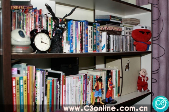 书架一角,琉克手办非常醒目。闹钟的时间不对。(河童:“很多天没上弦了……”)