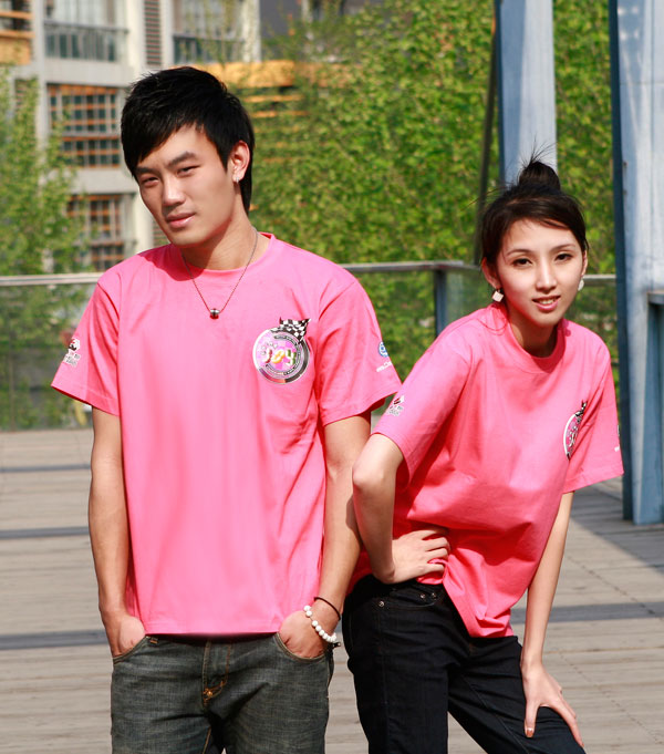 如同历届展会一样,“第七届ChinaJoy限量版纪念T恤”仍保持了同报广一样的色彩体系——时尚且可爱的粉色,胸前点缀这黑白发令旗+第七届如同赛车仪表的logo,使本届T恤充满了赛车游戏的氛围,展现出游戏玩家朋友可爱、动感、充满阳光的青春朝气。
