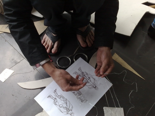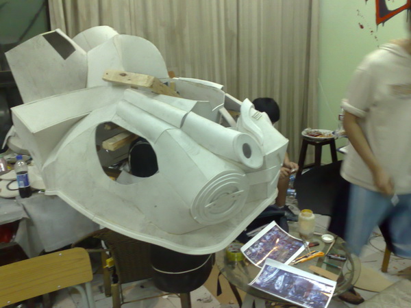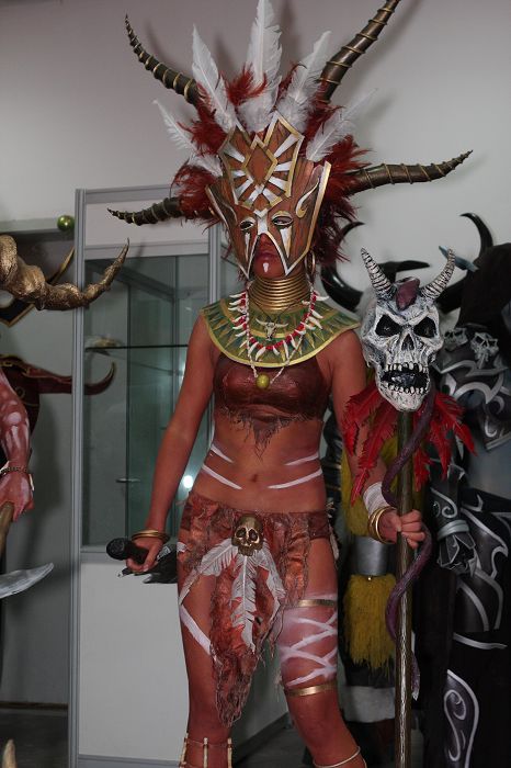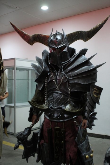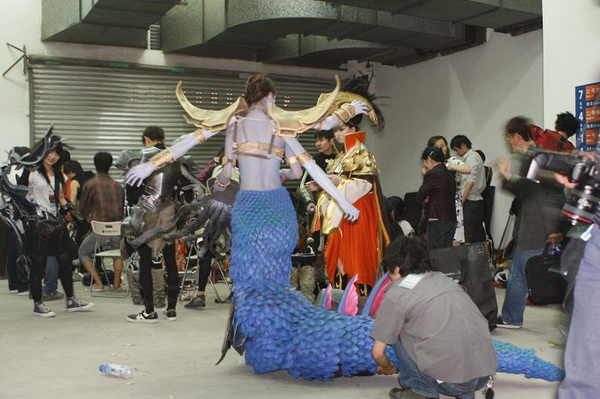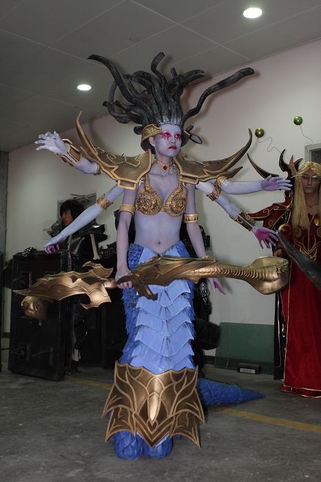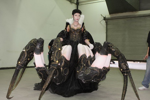 社团的骨干里以男丁居多,而且都偏好玩游戏,特别热衷的是暴雪出品的游戏,所以今年痛下决心出了一组名为“暴雪世界”的COS,这组剧由现任“世纪诺亚”负责人张翔带领,筹备了大半年,组织了30多个人,里面涵盖了大部分暴雪游戏中的经典角色,服装道具的难度也是有史以来最高的。虽说准备时间长,但是道具的工艺复杂,临近比赛的前一个月还是得天天加班,而且这组剧里新人也很多,对于道具制作的工艺一窍不通的也大有人在。“瓦斯琪”的鱼尾如何在台上行走,“蜘蛛女王”宽大的蜘蛛腿如何登上舞台,“机枪兵”一大堆装备的板型如何裁剪……等等头痛的问题堆积如山。不过生拉活扯的总算在比赛前一天准备妥当了。听到台下的欢呼声和大家兴奋的评论这是对“世纪诺亚”每个人最佳的回报。