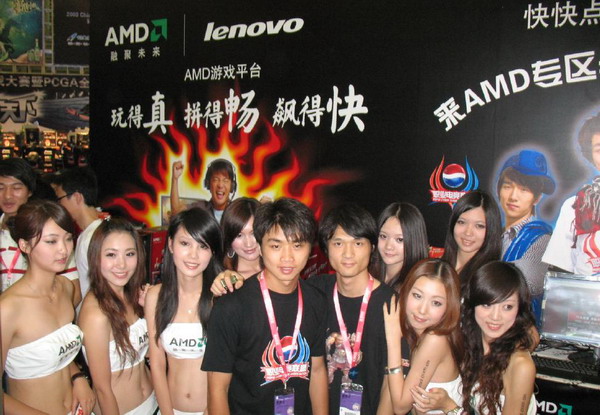 23日下午,Sky、Infi、TeD等知名WAR3选手均亮相现场,并且与玩家和AMD展台的ShowGirl进行了亲密合影。在AMD的展台上,玩家们还可以通过在现场电脑上提交自己的个人信息来参与活动,并且有机会获得AMD送出的精美礼品。