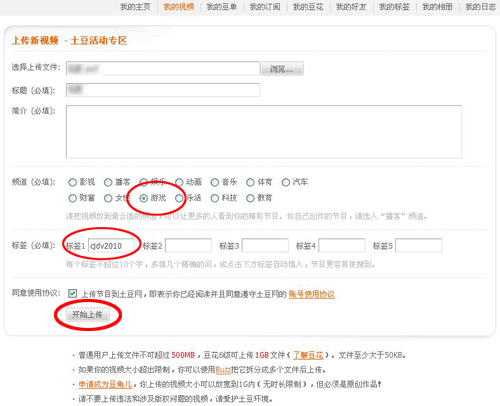 ¡¡¡¡5£®Ñ¡Ôñ“ÓÎÏ·”ƵµÀ£¬ÎªÊÓÆµÌí¼Ó“cjdv2010”±êÇ©£¬¿ªÊ¼ÉÏ´«ÊÓÆµ