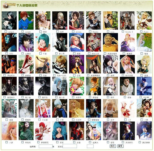 个人组:2010 ChinaJoy Cover Coser封面大赛迎来了更多实力强劲的优秀选手的积极参与,每周的优秀选手的评选都成为艰难的抉择,最后一轮周优秀选手更是惊现“死亡之组”。在评选入围作品期间,众评委在以前期产生的周优秀和推荐选手会作为参考信息的前提下,考虑到提交作品时间先后及票数的因素,为保证进入复赛的都是本次最有实力的选手,也为了让所有Cosplay爱好者在复赛中看到本届比赛中最有爱的图,众评委不辞辛苦的又将数千份作品重新审核,讨论评选,最后评选出了本届54名入围的个人选手作品。。