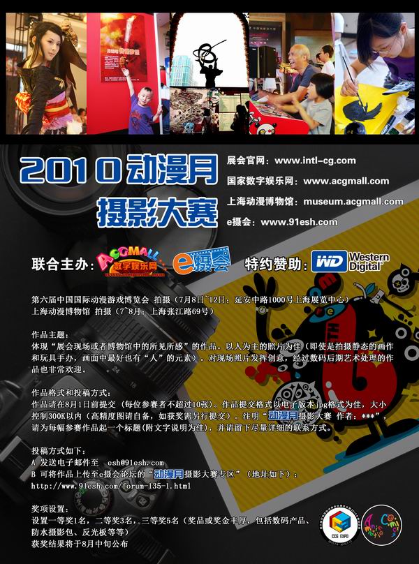 2010年7月,上海两大漫展“中国国际动漫游戏博览会”和“卡通总动员”强强联手,同掀夏日动漫风暴;而位于上海张江的动漫博物馆也正式迎客,各位漫友宅人COS迷们是否都已经做好武装到牙齿的准备?由国家数字娱乐网和e摄会联合打造的“2010动漫月摄影大赛”,让你在与大家一起分享动漫之夏的感动与精彩的同时,还能获取丰厚奖品或奖金 !