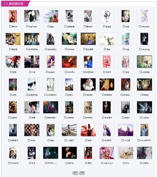 个人组:2011 ChinaJoy Cover Coser封面大赛迎来了更多实力强劲的优秀选手的积极参与,每周的优秀选手的评选都成为艰难的抉择,最后一轮周优秀选手更是再次惊现"死亡之组"的对决。在评选入围作品期间,众评委在以前期产生的周优秀和推荐选手会作为参考信息的前提下,考虑到提交作品时间先后及票数的因素,为保证进入复赛的都是本次最有实力的选手,也为了让所有Cosplay爱好者在复赛中看到本届比赛中最有爱的图,众评委不辞辛苦的又将数千份作品重新审核,讨论评选,最后评选出了本届56名入围的个人选手作品。。