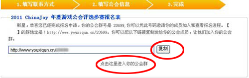 5.报名完成。报名信息填写完毕,游戏群将提供给游戏群链接和ID(链接最后的那串数字即为公会ID)。将生成的游戏群链接发给公会成员,邀请成员注册游戏群,获得奖项评选资格。