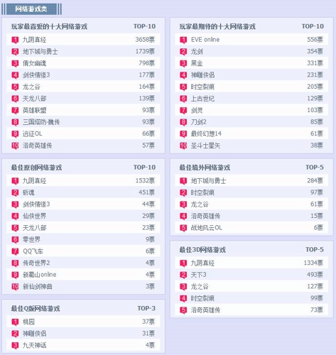 在网络游戏类奖项评选中,《九阴真经》以3658票的得票数在“玩家最喜爱的十大网络游戏”排行榜中遥遥领先,《EVE online》以556票多出第二名《龙剑》202票的优势在“玩家最期待的十大网络游戏”榜中领跑,“最佳原创网络游戏”中《九阴真经》依然以1532票的优势成为榜首,“最佳境外网络游戏”《地下城与勇士》的目前的位置让我们丝毫不感觉意外,“最佳3D网络游戏”《九阴真经》以1334票高居头牌,《桃园》目前以6票的微弱优势在“最佳Q版网络游戏”榜单中拔得头筹。自由投票期即将结束,目前看来《九阴真经》似乎已囊括了网络游戏奖项中的半壁江山。