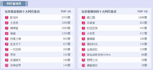 网页游戏类“玩家最喜爱的十大网页游戏”榜中竞争激烈,前四名的相差票数并不多,未来将有怎样的变数,我们仍将拭目以待。“玩家最期待的十大网页游戏”排行榜中《萌三国》以1688票得票数成为自由投票期最受玩家期待的网页游戏。
