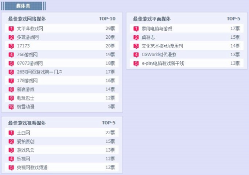 媒体类太平洋游戏网、多玩游戏网、17173分列“最佳游戏网络媒体”前三席,《家用电脑与游戏》和《土豆网》目前暂列“最佳游戏平面媒体”和“最佳游戏视频媒体”的首席。