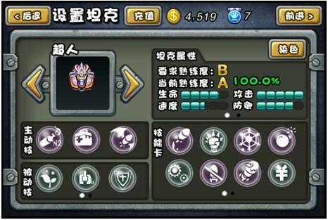 技能作为《坦克部队!》的特色之一,在结合FC时代坦克大战经典玩法的同时,又增添出许多特色技能系统。游戏中的坦克技能多达21种,分主动技能与被动技能两种形式,玩家在作战时,可根据实际需要,对数百种不同技能进行自由组合。此外,还可通过勋章来强化技能,瞬间提升坦克作战能力。战斗获得的金币不仅可以用来购买勋章,还可以扩充技能槽。