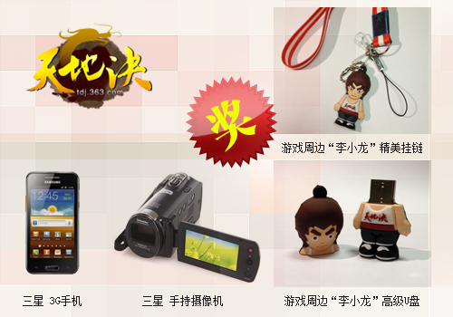 为回馈广大玩家一直以来的期待之情,境界《天地决》将通过此次金翎奖票选活动放送百万豪礼。凡是积极投票支持你所喜爱的网游《天地决》的玩家均有机会获得由境界游戏独家提供数码好礼,包括三星3G手机、三星手持摄像机,或者是限量版独家定制的“李小龙”高级U盘 和“李小龙”精美挂链若干。