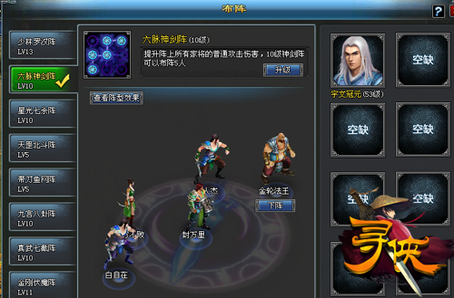 在布阵系统中,玩家可对各种不同特色的家将进行阵型排列,然后可攻打征战势力里的恶势力部队。不同的阵法有不同的效果加成。增加了战斗的可变性,从而提高了游戏的乐趣。