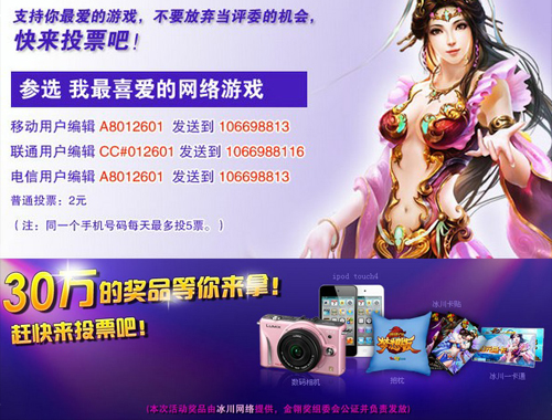 注:由于运营商通道限制,本次活动安徽、湖北、湖南、江西、河南 的移动用户,甘肃、湖北、河南、青海、辽宁、内蒙古、宁夏、山东、安徽、上海、广东 的联通用户,将无法参加本次投票,其他地区及电信用户都可以正常参与。北京用户可正常参于投票,但无法获得即得奖。由此带来的不便请您谅解,感谢您对于比赛的支持!