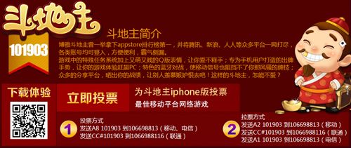 被誉为中国游戏界“奥斯卡”的游戏评选活动”金翎奖”正在火热评选中,博雅斗地主作为中国移动平台网络游戏也加入了这场征战中,期待你们的肯定。