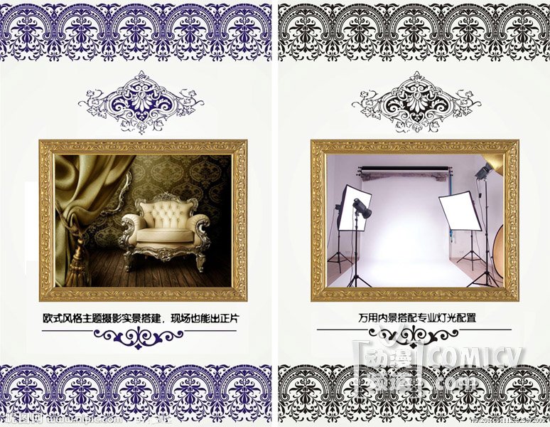 摄影工作区:主题风格为欧式风格 包含 欧式沙发 窗帘 以及相关摆设 另设绿色背景 灯光等基础设施