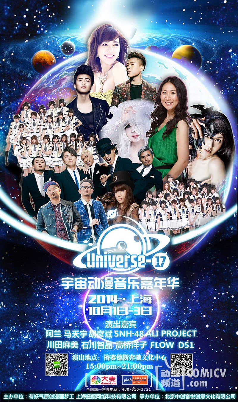 宅腐集结,闹翻宇宙!2014首届“u17”宇宙动漫音乐嘉年华将于10月1日—3日登陆上海梅赛德斯—奔驰文化中心。马天宇、胡彦斌、阿兰、超人气美少女天团组合SNH48、高桥洋子、川田麻美、Flow等中日明星以及众多国内知名ACG唱见、配音加盟,与动漫爱好者零距离接触,掀起一股二次元音乐狂潮。