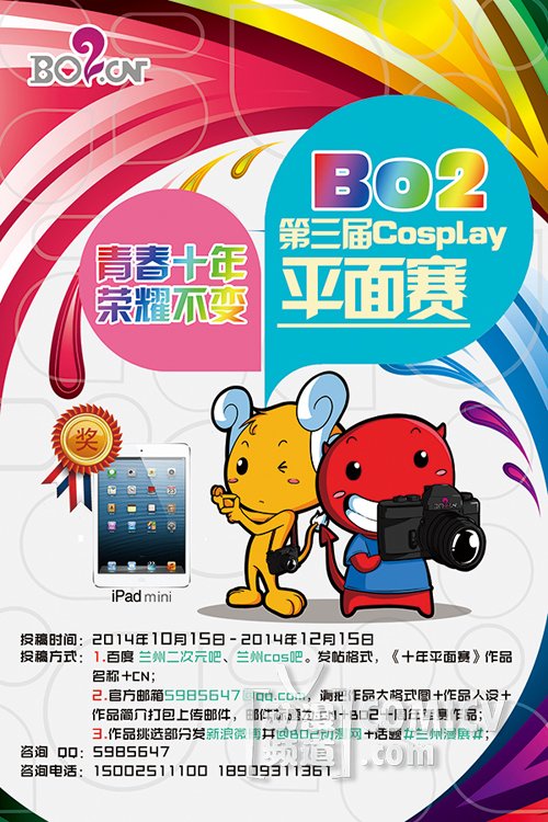 礼品的部分,本次简直是种类丰富目不暇接,各种丰富的动漫纪念周边即将公布,而且三台IPADMINI等你带回家!平面赛我们送出一台,活动两日每天抽奖我们送出一台,更有BO2动漫十周年纪念会员卡(微信专属卡)免费赠送!