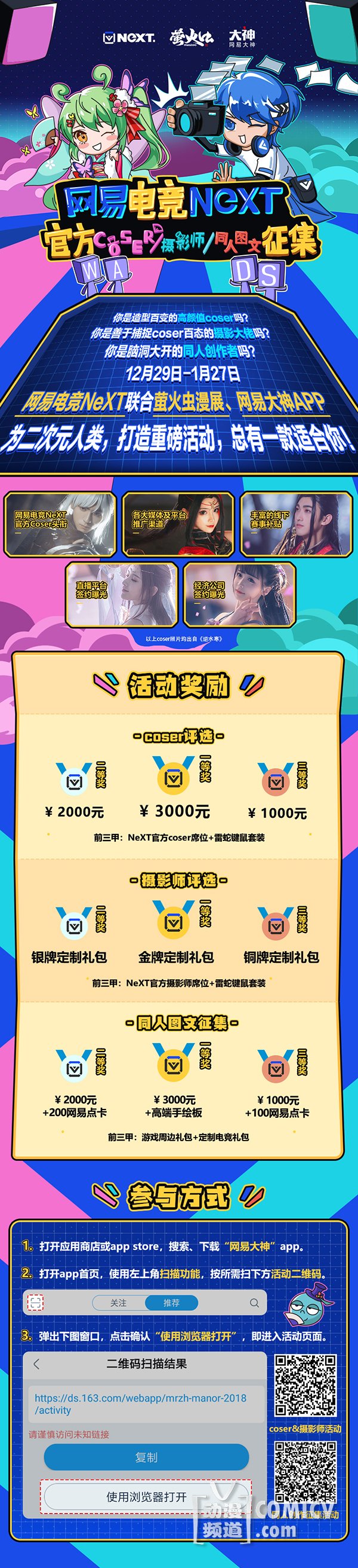 你是造型百变的高颜值coser吗?你是善于捕捉coser百态的摄影大佬吗?你是脑洞大开的同人创作者吗?网易电竞NeXT联合萤火虫漫展、网易大神app,为二次元人类,打造重磅活动,总有一款适合你!